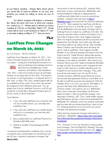 Our March program will feature a presenta- bitwarden.com/ and download the Chrome extension