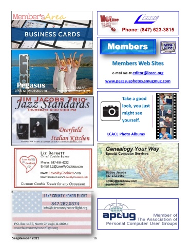 Phone: (847) 623-3815 Members Members Web Sites e-mail me at editor@lcace.org www.pegasusphotos.smugmug.com Take a good look, you just might see yourself. LCACE Photo Albums Seeptember 2021 10